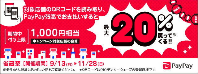 paypayでお支払いいただくと最大20%(期間中付与上限1,000円相当)戻ってくる!!対象店舗です。